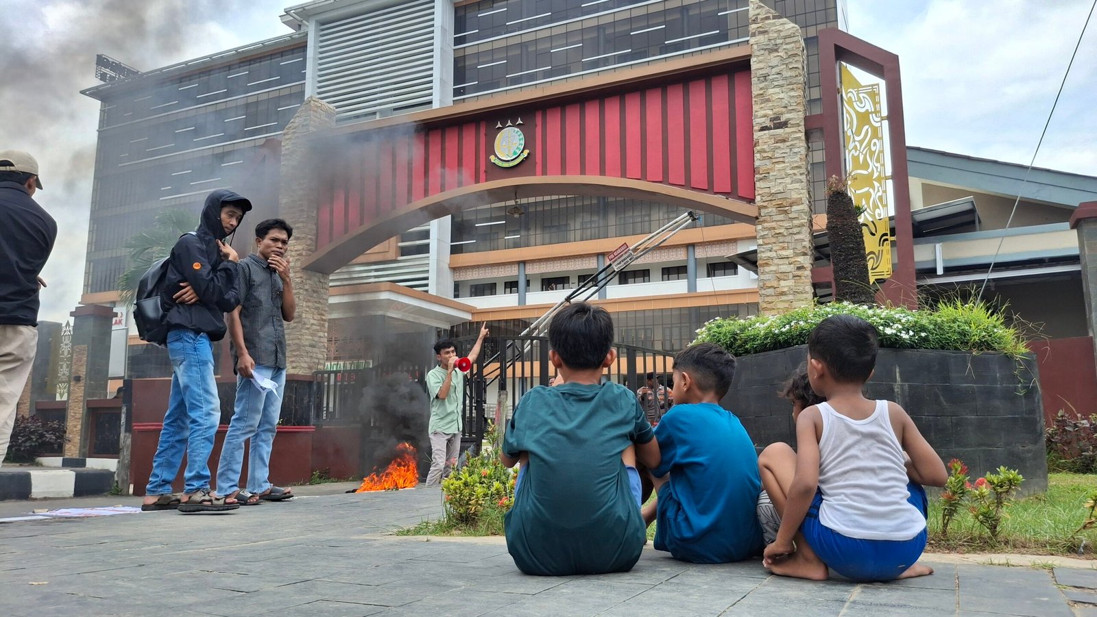 Terlihat beberapa anak-anak sedang menonton massa aksi dari GMPPKK, di depan Kantor Kejati Kaltim.(Yhon)
